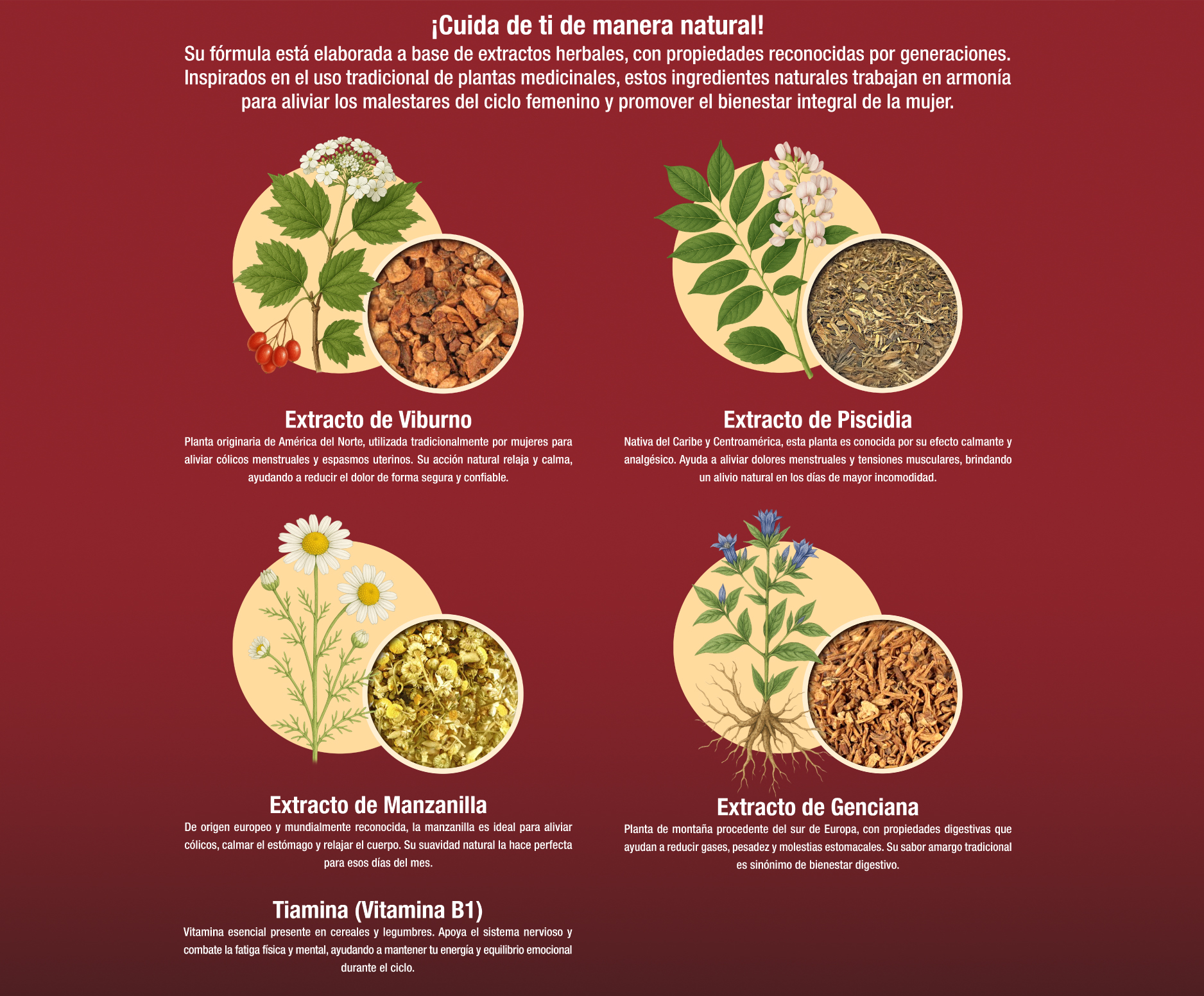 Está indicado para trastornos ginecológicos como la dismenorrea y la vulvovaginitis, así como para el síndrome del intestino irritable. Actúa como regulador del ciclo menstrual, alivia cólicos y dolores, y posee propiedades antiinflamatorias, analgésicas, antipiréticas y sedantes. Además, favorece la fertilidad, fortalece el sistema inmunológico y mejora la producción de glóbulos rojos y blancos.